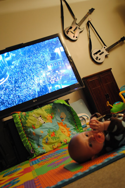 Evey finally fell asleep on the drive home around 12:45am, almost five hours after her bedtime! When we got home and I pulled her out of her carrier, she was solid gone. I gave her one last feeding and put her down for the morning. She slept until 9am, but has napped for most of the day! The three of us have spent our first day of 2012 together, watching Grimm, snuggling and playing. Evey and I took a nap on the couch and now she's playing in her jumparoo while I blog and Christopher plays video games. I must say that this is the best way to spend the day!